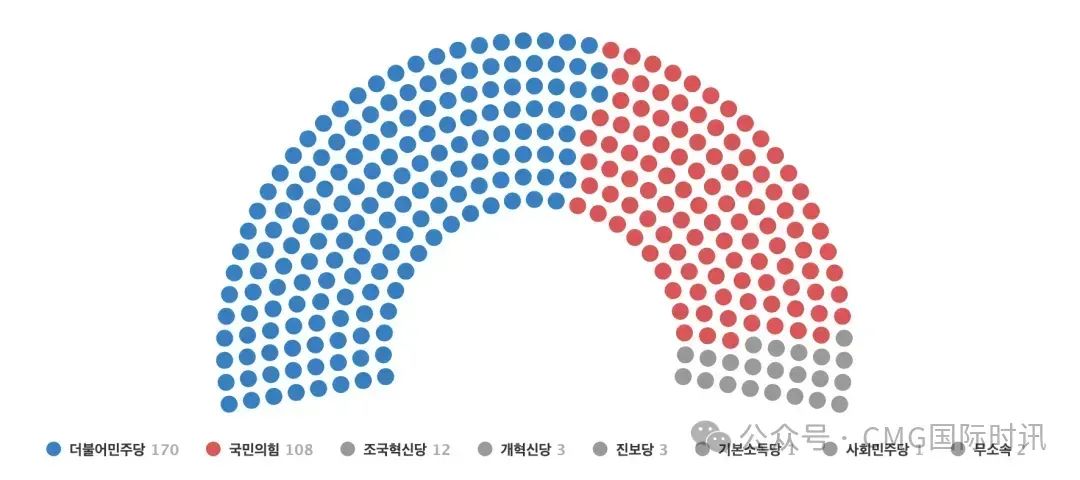 ▲ 韩国国会议席散播(蓝色为共同民主党170席、红色为捏政党东谈主民力量党108席、其他党派22席)
