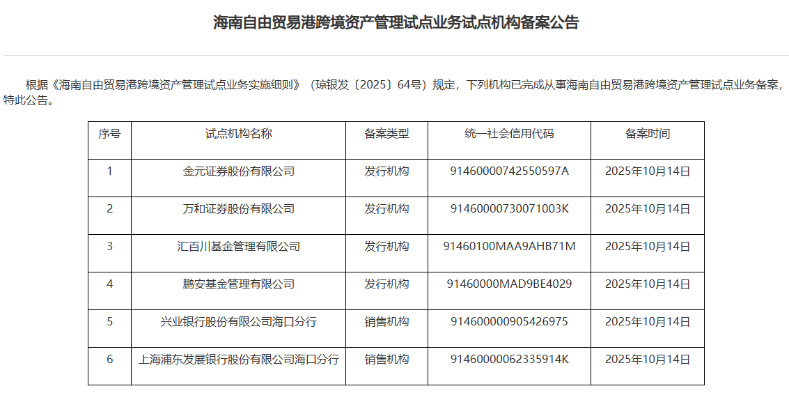 上证报中国证券网讯(记者 何漪)10月15日,海南证监局发布《海南目田买卖港跨境钞票措置试点业务试点机构备案公告》。公告显现,10月14日,金元证券、万和证券、汇百川基金、鹏安基金、兴业银行海口分行、上海浦发银行海口分行已完成从事海南目田买卖港跨境钞票措置试点业务备案。